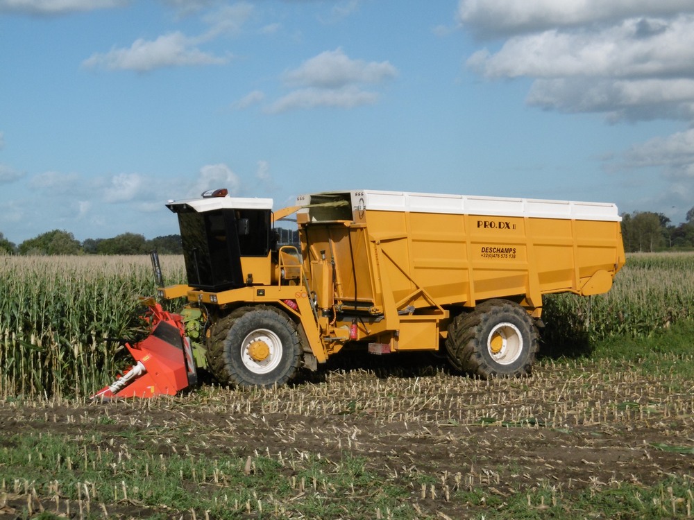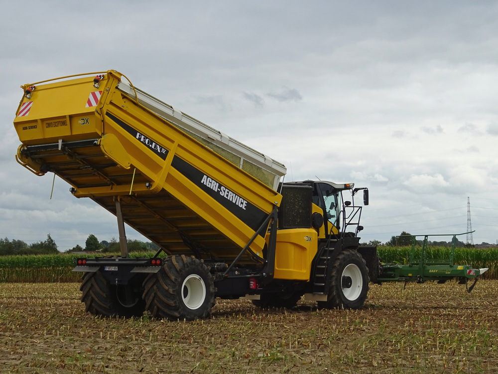 Thierry Dutrieux wilde dat de vultrechter van zijn machine aan de achterkant werd gelost voor meer stabiliteit bij het legen. Hoewel deze configuratie het niet mogelijk maakt om de veldhakselaar tijdens het rijden te legen, haalt hij toch dezelfde opbrengst per uur als een conventionele hakselaar op de kleinere percelen die zo gebruikelijk zijn in de regio Doornik, waar de familie Dutrieux werkt. In feite gaat het legen heel snel en gaat er heel weinig tijd verloren. De kipperchauffeurs hoeven de machine niet te volgen, dus er gaat geen tijd verloren met manoeuvreren. De hakselaar kan ook snel werken dankzij zijn krachtige 12-cilinder Liebherr motor.