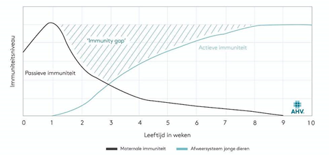 Kalveren worden geboren met een volledig ontwikkeld immuunsysteem. In de eerste levensdagen van het kalf bevindt het immuunsysteem zich nog in de passieve fase en werkt het eigen immuunsysteem nog niet naar behoren. Door biestopname wordt dit geleidelijk ontwikkeld naar een actief systeem. Bij de overgang van passief naar actief is er een dip in het immuunsysteem. Hieronder zie je een afbeelding die duidelijk toelicht waar het immuunsysteem het zwakst is.