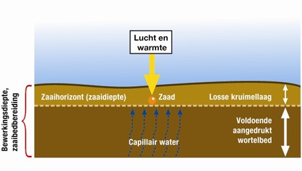 Voor een snelle beginontwikkeling dient een goede zaaibedbereiding plaats te vinden. Een zaaibedbereiding kan alleen dan starten, wanneer de grond ‘bekwaam’ is. Dat willen zeggen: het maken van een goed zaaibed niet ten koste gaat van de structuur van de grond. Ook hiervoor geldt weer dat geduld bewaren en een goede organisatie/planning van de grondbewerkingswerkzaamheden een hoop problemen tijdens de groeiperiode kan voorkomen. Een goed zaaibed zorgt voor een goede water- en luchthuishouding en stimuleert een snelle opwarming van de zaaihorizont. Dit is door het in Nederland ingevoerde fosfaatbemestingsverbod op derogatiebedrijven nog belangrijker. Door het ontbreken van de zogenaamde ‘startfosfaat’ is een snelle opwarming van de grond, een daarmee vlotte kieming van het zaad en een goede beginontwikkeling van het jonge plantje cruciaal! Deze zaaihorizont dient los en kruimelig en de ondergrond zonder verdichtingen te worden klaargelegd (zie afbeelding).