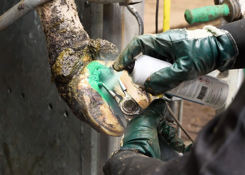 De momenten tussen bekapbeurten zijn cruciaal om het kreupelheidspercentage laag te houden. Dit kan door middel van groepsbehandeling. “Een mooi voorbeeld is bij een melkveebedrijf waar we recentelijk zijn begonnen met onze nieuwe service: sprayen. Hiervoor wordt Intra Hoof-fit Spray gebruikt. Elke zaterdag tijdens het melken worden alle koeien gesprayd. Dit werkt efficiënt, de koeien wennen er snel aan en er is snel resultaat te zien. Waar ik in het begin op dit bedrijf bij het bekappen zes tot zeven rolletjes voor circa vijftien koeien nodig had, waren het bij de laatste twee keer bekappen slechts twee koeien die een verband nodig hadden. Preventief behandelen geeft een goed resultaat.”