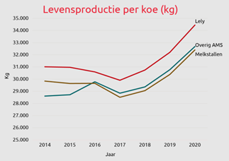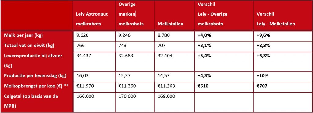De groep melkveehouders met een Lely Astronaut melkrobot behalen de beste resultaten op het gebied van melkproductie, levensproductie en melkkwaliteit. Zij realiseren de hoogste gemiddelde levensproductie en de hoogste productie per levensdag. De hoogte productie per levensdag is een belangrijk kengetal. Deze parameter is een weergave van het totale bedrijfsmanagement waarbij jongveeopfok, vruchtbaarheid, droogstand, melkproductie en gezondheid een rol spelen. Deze resultaten zijn ook terug te zien in de totale melkopbrengst per koe. Op een bedrijf met een Astronaut melkrobot is dit €610 euro hoger ten opzichte van met een ander merk melkrobot en €707 ten opzichte van een bedrijf met een melkstal. Een optimale productie per levensdag resulteert uiteindelijk in een hoge levensproductie. Ook hebben koeien op melkveebedrijven met een Lely melkrobot(s)gemiddeld het laagste celgetal. Management gericht op gezonde koeien met een optimale melkproductie geeft een hogere levensproductie.