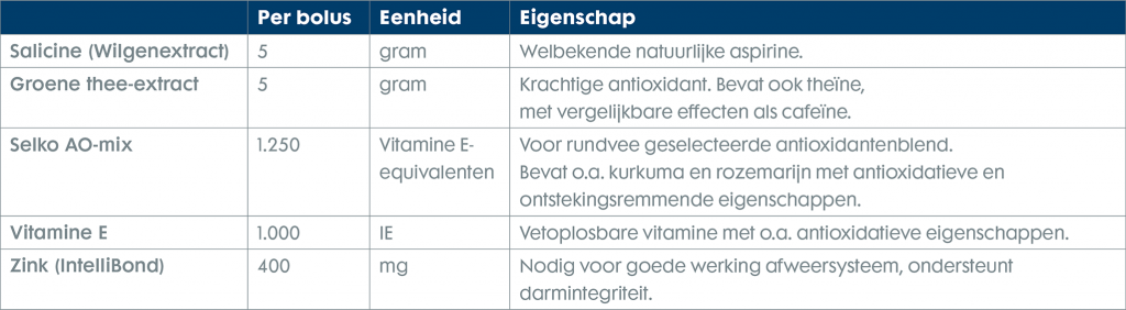 Wilgenbast is dus een aspirine uit de natuur. Daarnaast bevat Farm-O-San Relief groene thee-extract met sterke antioxidanten en theïne aangevuld met Selko AO-mix. Selko AO-mix is een blend van sterke antioxidanten specifiek geselecteerd voor effectiviteit in rundvee, met bijvoorbeeld kurkuma en rozemarijn.