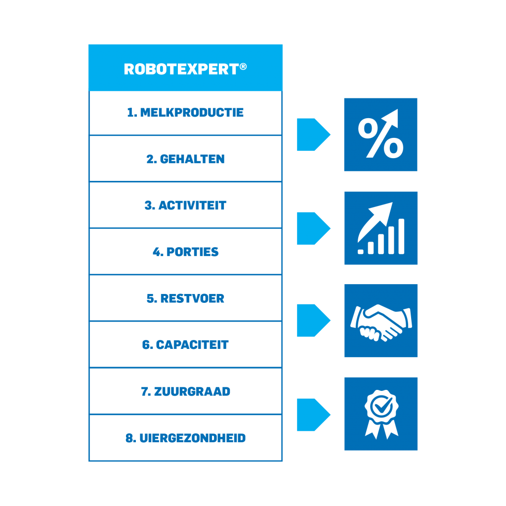 Ons RobotExpert-programma analyseert de gegevens van je veestapel op acht belangrijke punten; melkproductie, gehalten, activiteit, porties, restvoer, capaciteit, zuurgraad en uiergezondheid (zie afbeelding 1).