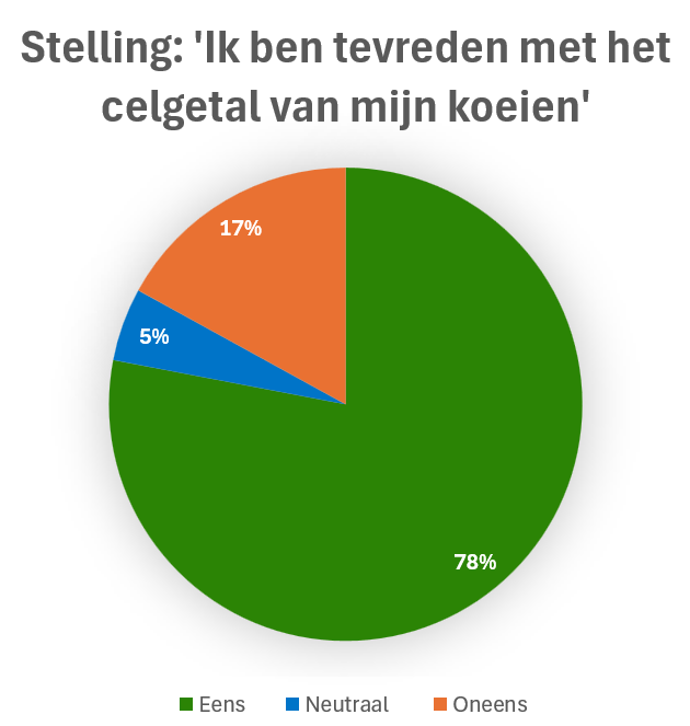 Cijfers zijn echter wat anders dan de persoonlijke beleving. De medewerkers van het callcenter van Prosu besloten daarom onderzoek te doen naar tevredenheid over het celgetal op Nederlandse melkveebedrijven. In de periode december 2024 tot en met maart 2025 vroegen zij een groep van ruim 800 melkveehouders te reageren op de stelling ‘ik ben tevreden met het celgetal van mijn koeien’. 78 procent van de ondervraagden sluit zich aan bij deze stelling, dus is op dit moment tevreden met het celgetal op zijn of haar bedrijf. Vijf procent antwoordde ‘neutraal’ en zeventien procent is het niet eens met deze stelling.