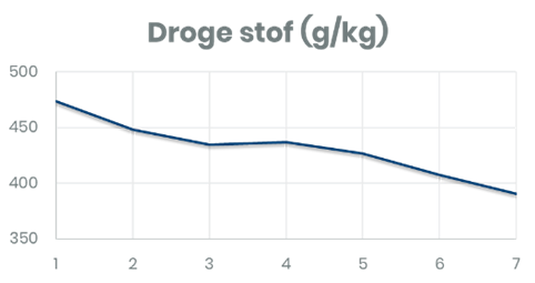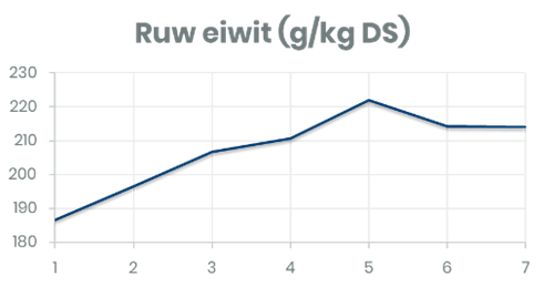 In de praktijk komt het meer dan eens voor dat de kuiluitslag niet overeenkomt met het gevoerde ruwvoer op dat moment. Dat die variatie in graskuil en maiskuil aanwezig is, blijkt uit eigen onderzoek van Trouw Nutrition. In 2020 is gekeken naar de verandering van de chemische samenstelling van gras- en maiskuilen. 10 graskuilen en 9 maiskuilen werden gedurende 2 maanden wekelijks gemeten. Uit de resultaten blijkt dat het droge stof gehalte van zowel gras- als maiskuilen door de tijd significant verandert. Een sprekend voorbeeld van een verandering in graskuilsamenstelling is te zien in figuur 1, waarbij naast de droge stof ook het eiwitgehalte significante verschillen laat zien.