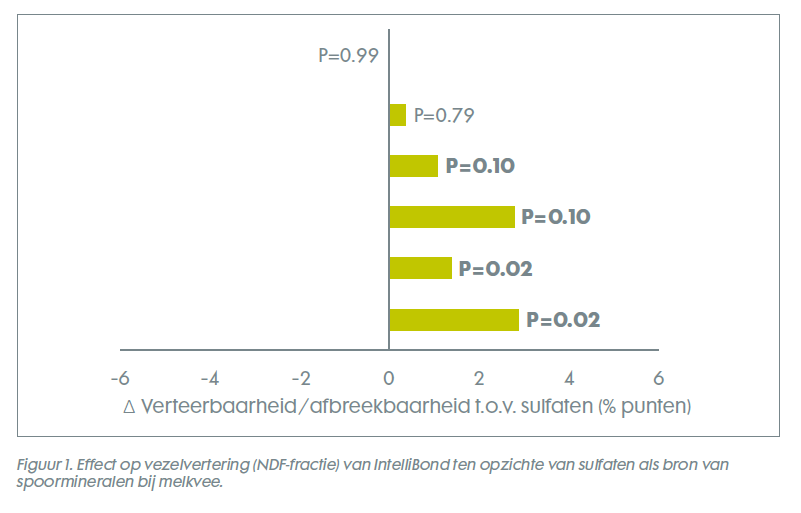 Figuur 1. Effect op vezelvertering (NDF-fractie) van IntelliBond ten opzichte van sulfaten als bron van spoormineralen bij melkvee.