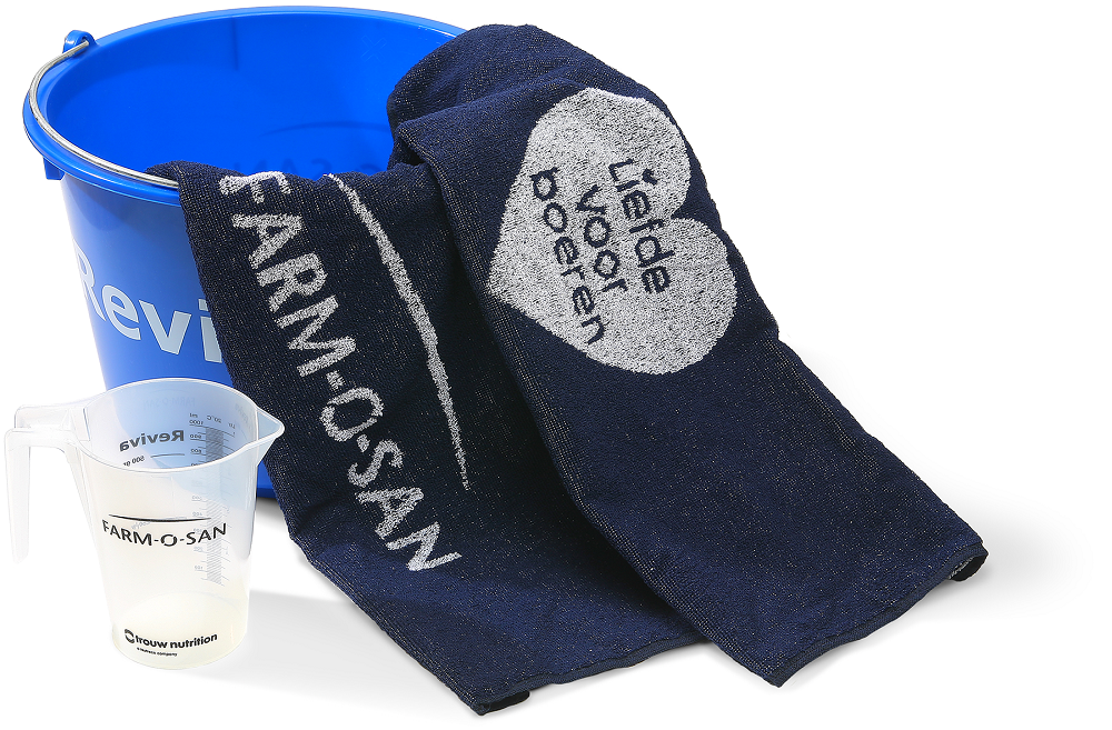 Deze zomer krijg je bij aanschaf van 2x 7 kg Farm-O-San Reviva en 20 kg Farm-O-San Gluconomic een badhanddoek, grote emmer en maatbeker cadeau.