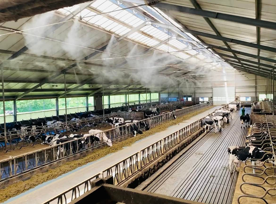 Voorkom hittestress bij melkvee, zodat de melkproductie, activiteit en gezondheid gewaarborgd is. Het stalkoelingssysteem van Atec Solutions is speciaal ontworpen om staldieren koel te houden, door de lucht in stallen te koelen met 8 °C graden.