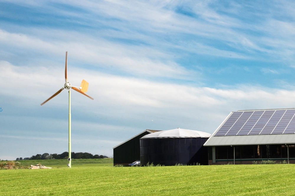 In ons land waait het drie keer vaker dan dat de zon schijnt en in de winter waait het harder en vaker dan in de zomer. Als de wind gaat liggen, schijnt meestal de zon. Hierdoor kunnen zonne- en windenergie goed samenwerken. In de zomer levert de zon te veel stroom en te weinig in de winter. Een windmolen levert het hele jaar door stroom: dag en nacht, zomer en winter. Een bescheiden hoeveelheid zonnepanelen ondersteunt de energieproductie op windstille dagen. Hoe minder stroom het erf verlaat, hoe beter. Deze combinatie is de meest effectieve manier om uw boerderij van stroom te voorzien.