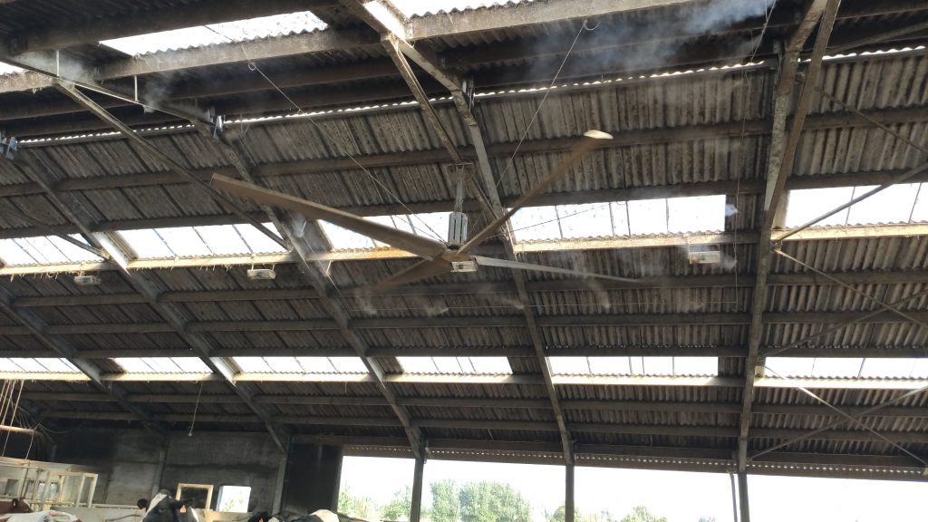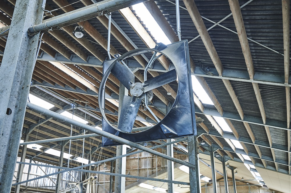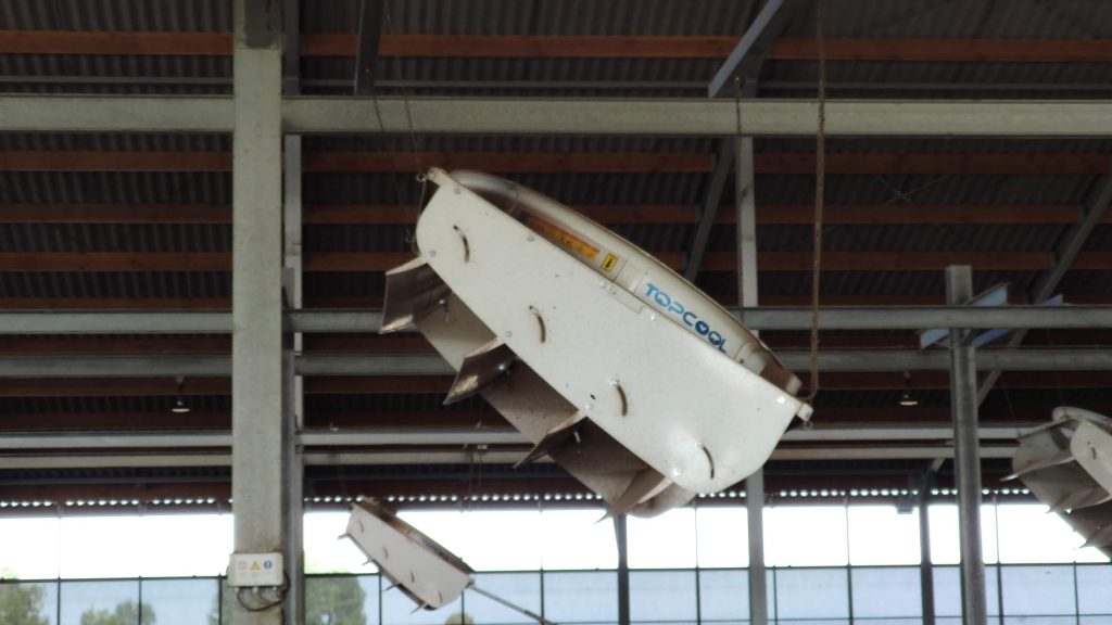 In de stal kunnen we de luchtsnelheid verhogen met behulp van ventilatoren. Er zijn drie types ventilatoren. De HVLS-ventilatoren (High Volume, Low Speed), de zogenaamde ‘helikopterventilatoren’ verplaatsen grotere volumes lucht aan lagere snelheden in verticale richting naar beneden.