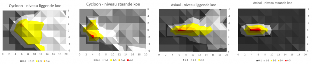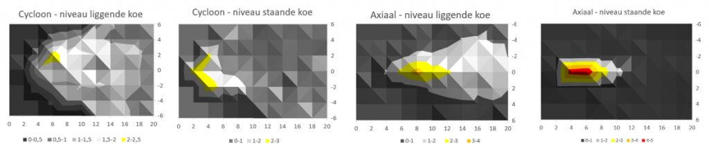 In het demonstratieproject ‘Eerste hulp bij hittestress koe’ uitgevoerd door Boerenbond, Hooibeekhoeve, ILVO en Inagro, werden in de ILVO-melkveestal en een ILVO-proefopstelling luchtsnelheidstesten en rookproeven uitgevoerd op axiale ventilatoren en een cycloonventilator (enkel proefopstelling). Hierbij werd bij verschillende frequenties en draaihoeken gekeken naar de luchtsnelheden op verschillende afstanden in zowel de lengte- als breedterichting ten opzichte van de ventilator (figuur 2).