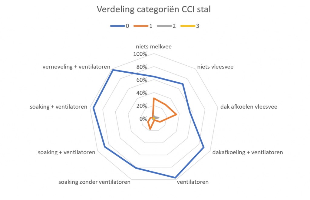 Figuur 1: Mate van waargenomen hittestress per opgevolgde stal/techniek (0 = geen hittestress, 1 = lichte hittestress, 2 = matige hittestress, 3 = erge hittestress)