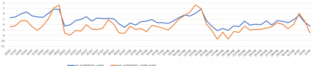 Figuur 2: Gemiddeld dagelijks verschil in rel. vochtigheid stal vs. meteo met en zonder watertechnieken in de stal