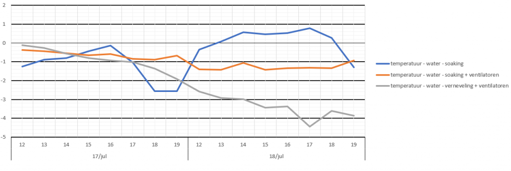 Watertechnieken worden gezien als bijkomende technieken. Dit houdt in dat ze pas bij ergere hittestress, in de praktijk bij een staltemperatuur vanaf 25-26 graden Celsius worden ingezet, naast de reeds aanwezige ventilatoren. De resultaten van de opgevolgde stallen bevestigen dit (figuur 1).