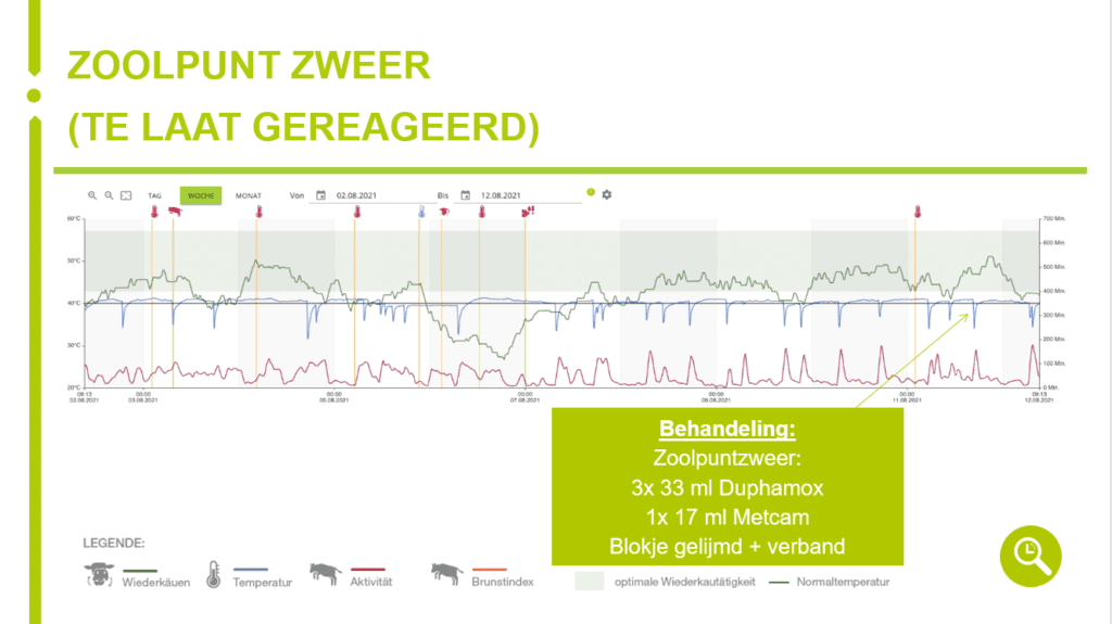 De gegevens die de bolus doorgeeft, worden opgeslagen in de cloud. De melkveehouder en adviseurs van smaXtec kunnen deze gegevens, die doorlopend in een grafiek worden verwerkt, bekijken. “Zo kun je bij een zieke koe precies zien wat eraan vooraf is gegaan. Aandoeningen als mastitis, ketose, melkziekte, lebmaag, longontsteking, scherp in, maar ook kreupelheid worden allemaal voorafgegaan door een typisch verloop van temperatuur, herkauwactiviteit, wateropname en activiteit. Hieruit kun je, in samenhang met het lactatiestadium, met grote mate van zekerheid afleiden wat er met de koe aan de hand is. Je kunt op basis van de data zelfs voorspellen dat de koe ziek wordt”, vertelt Van der Zijl.