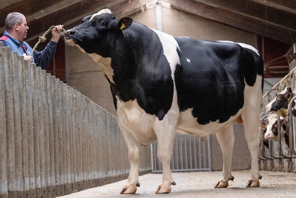 “Helga is een Fleckviehkruisling en nog topfit. Ze is goed in conditie en heeft nog nooit een veearts nodig gehad. Als alles goed gaat kalft ze in april voor de 17e keer”, vertelt Christiaan van Walderveen. “Fleckvieh kruislingen worden doorgaans ouder dan zuivere Holsteinkoeien. Ze zorgen voor meer honderdtonners dan gemiddeld”.
