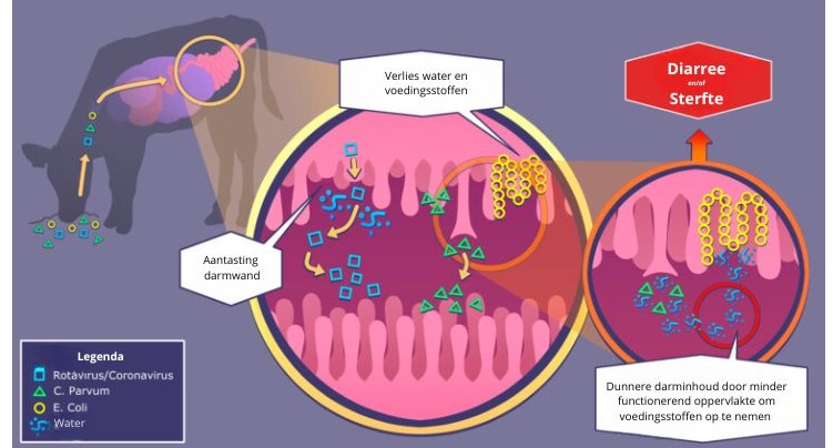 Diarree kan ontstaan onder invloed van verschillende factoren, van huisvesting en hygiëne tot stress en verminderde afweer. In de meeste gevallen begint diarree bij de opname van een bacterie of virus via het voer. In de darmen tasten deze ziekteverwekkers de darmwand aan (Figuur 1). Hierdoor kunnen er minder voedingsstoffen worden opgenomen. Daarnaast verhogen de achtergebleven voedingsstoffen de concentratie in de darmen. Dit trekt water aan uit de bloedbaan. De darminhoud wordt dunner en dit wordt aan de buitenkant gezien als diarree. Het kalf wordt dan minder vitaal, slapper, droogt uit en is gevoeliger voor andere ziektes.