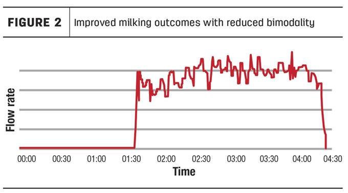Wanneer bimodaliteit wordt verminderd, kan een betere melkstroom worden gerealiseerd. Figuur 2 toont hoe een optimale melkbeurt eruitziet: zodra het melken begint, start de melkstroom direct en blijft constant tot het einde van de melkduur.