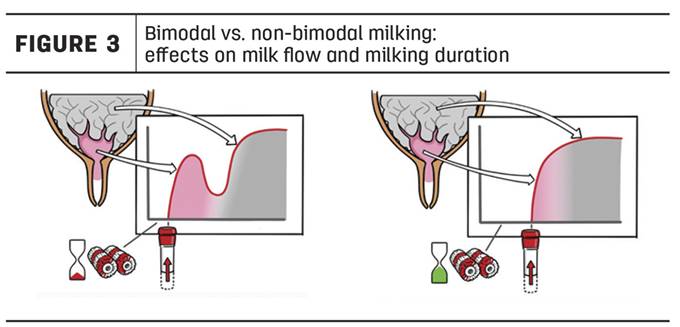 Bimodaliteit kan ervoor zorgen dat de speen anders in de tepelvoering past. Deze verandering kan leiden tot een verhoogd vacuüm in het kopstuk van de tepelvoering, wat ophoping in het speenweefsel veroorzaakt. Dit kan leiden tot langzamer melken en ongemak bij de koe, waardoor de kans op een volledige melkafname afneemt.