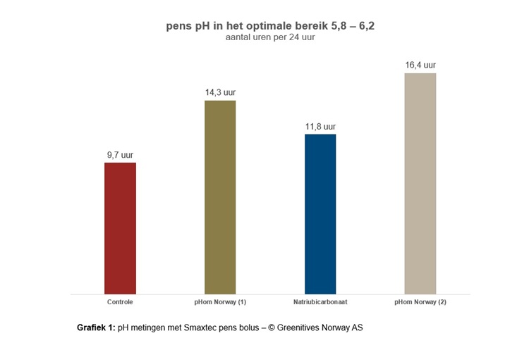 Het praktijkonderzoek werd ook ondersteund door studenten van de agrarische hogeschool in Dronten. Zij onderzochten het effect van het Noorse supplement ten opzichte van natrium bicarbonaat. Dit onderzochten ze bij dertig lacterende koeien, die elk waren uitgerust met een Smaxtec pH-bolus. Met meer dan 360.000 pH-metingen werd het verschil inzichtelijk. De pens-pH met het supplement bleef twee tot vier uur per dag langer in het optimale bereik. Ten opzichte van de pens met natrium bicarbonaat. Het onderzoek werd uitgevoerd onder stabiele en zeer goede omstandigheden. Het doel was om zelfs in een situatie waarin alles al goed loopt, nog verdere optimalisatie te kunnen vaststellen.