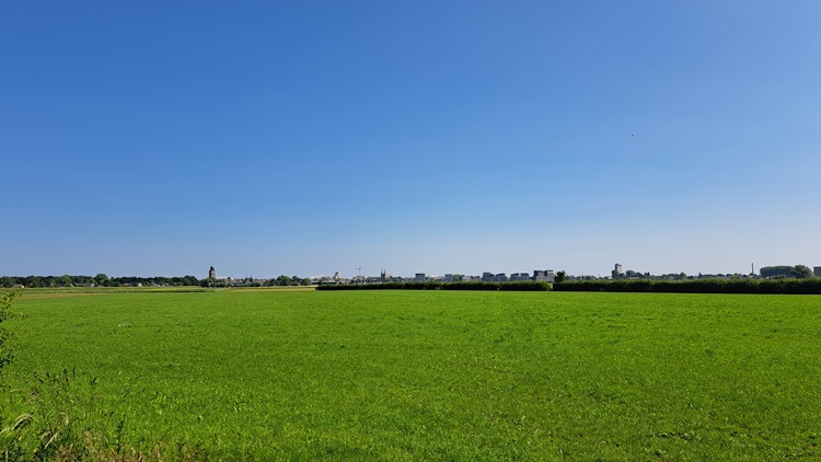 Het bedrijf van de familie Klunder ligt in de uiterwaarden van de IJssel. De skyline van Deventer, aan de andere kant van de rivier, is vanachter het bedrijf goed te zien.