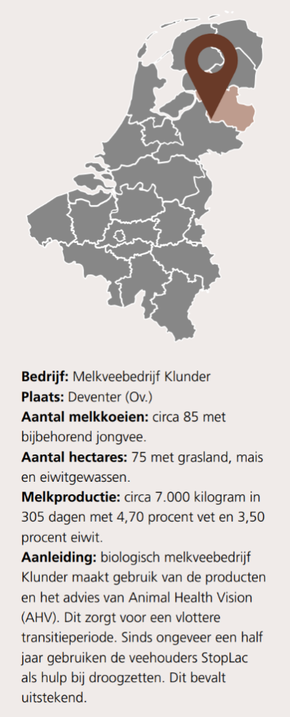 Sinds ongeveer een half jaar heeft Klunder een nieuwe hulp bij het droogzetten: StopLac Tablet. Dit helpt de koe vlot op te drogen. Klunder: “Als een koe drooggezet moet worden, dan wordt ze na melken gesepareerd, vastgezet, gedipt. Vervolgens geven we de StopLac Tablet. Dat doen we bij alle koeien. Je staat ervan te kijken hoe snel een koe dan opdroogt. Zo geven ze nog tien tot vijftien liter melk en zo staan ze droog. Van lekkende koeien in de droogstand hebben we geen last.” Marcel Koekoek legt uit hoe StopLac werkt. “Het zorgt ervoor dat op pensniveau de aanmaak van propionzuur gedurende 18 tot 24 uur gestopt wordt. Propionzuur is nodig voor het aanmaken van glucose, dat weer nodig is voor lactose, een belangrijk bestanddeel van melk. Geen propionzuur betekent geen melk. Door de koe ook meteen op droogstandsrantsoen te zetten, komt de productie daarna ook niet meer op gang.”