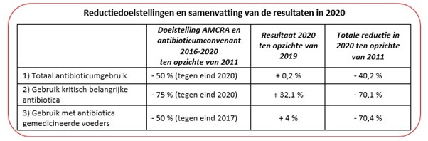 Het einde van het eerste antibioticumconvenant 2016-2020 wordt gekenmerkt door het ruimschoots behalen van de reductiedoelstelling voor het gebruik van met antibiotica gemedicineerde voeders. Ook het totale gebruik van antibiotica en het gebruik van de kritisch belangrijke antibiotica daalde sterk tussen 2011 en 2020. Toch worden de vooropgestelde doelen hier niet behaald, aangezien in 2020 het totale gebruik niet verder daalde en het gebruik van de kritisch belangrijke antibiotica zelfs sterk steeg ten opzichte van 2019.
