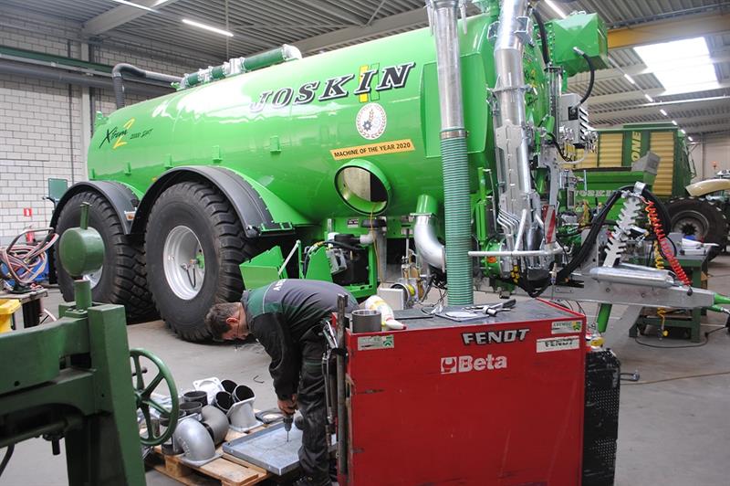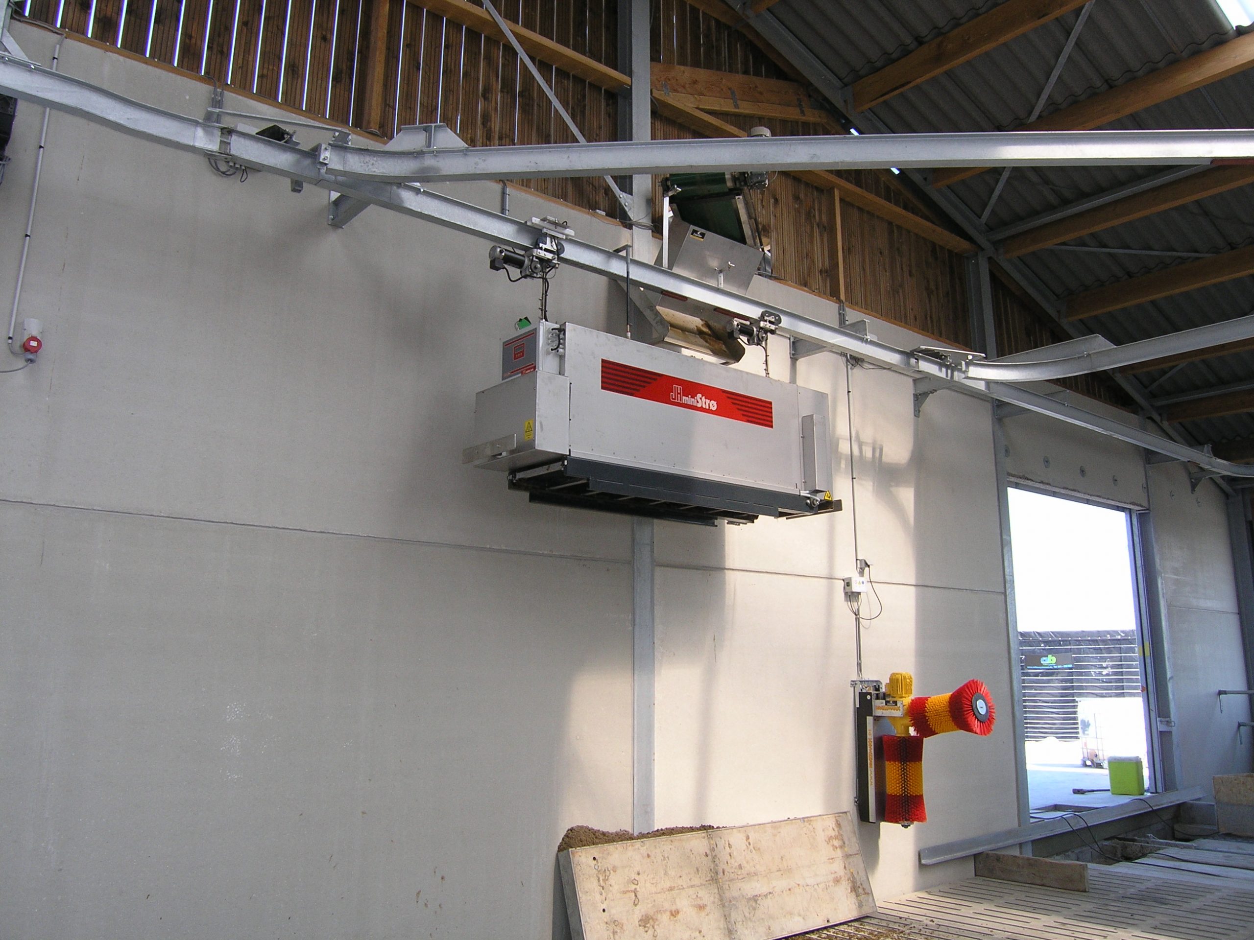 Alle ligboxen zijn van het type diepstrooiselbox. Ze zullen met gedroogde mest ingestrooid worden. Een klus die volledig geautomatiseerd werd. Na een passage langs een mestscheider – helemaal achteraan de stal op zo’n 4 à 5 meter hoogte geïnstalleerd – wordt de materie (Filip heeft het over ‘green bedding’) volautomatisch door een ministrooier opgehangen aan een rail, rechtstreeks in de ligboxen gedropt ter hoogte van de kop van de dieren.