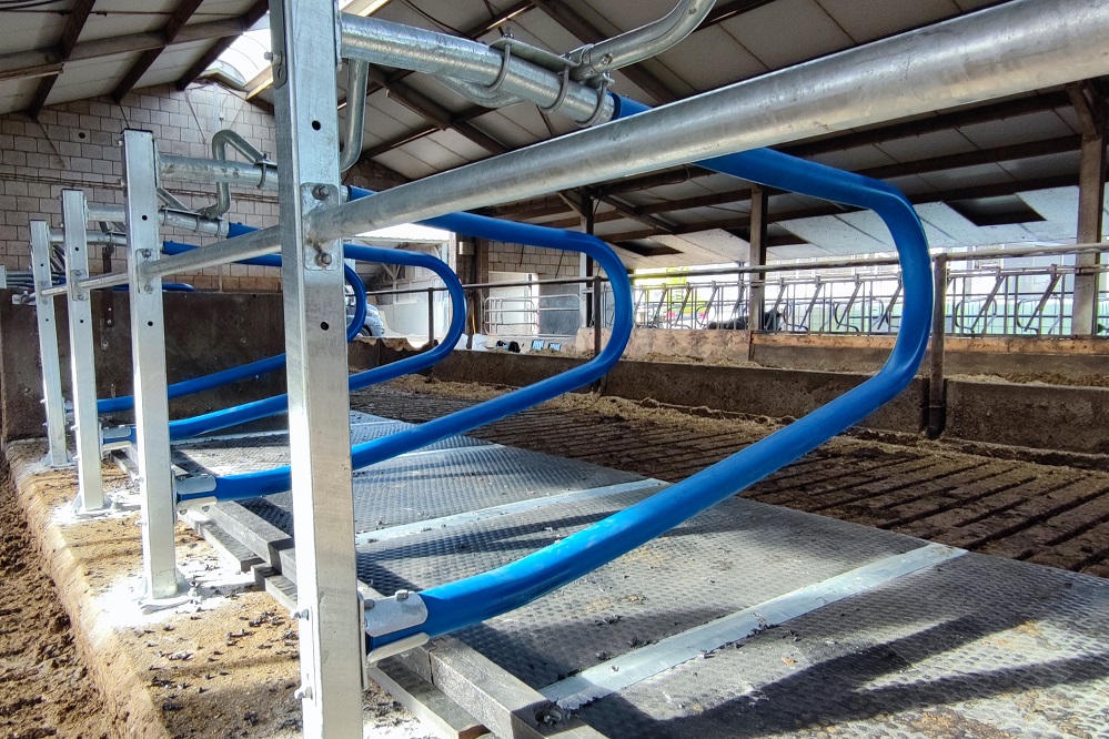 | Bijzonderheden | Ligboxafscheiding in hoogte verstelbaar | Schoftboom ligt in propyleen houders, kan verticaal bewegen | Voorzien van krabber op | Volledig per stuk geleverd, ook kop- en schoftboom | Dunne beugels, gebruik van glasfiber | Alleen aan de onderzijde flexibel, beweegt mee met de koe |