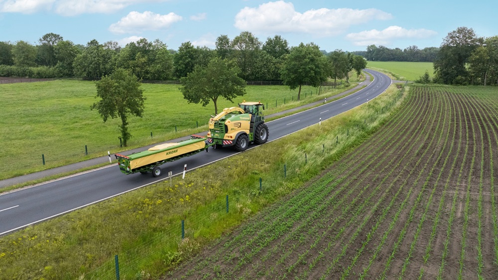 Voor transport over de weg zwenkt de bestuurder het rijmechanisme en de dissel eenvoudig weer terug in de transportstand, zet de directe snij-inrichting op de grond en koppelt die dan aan de aanhangerkoppeling van de veldhakselaar.