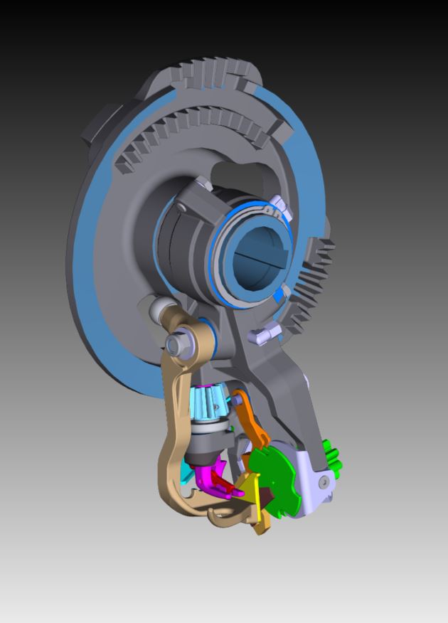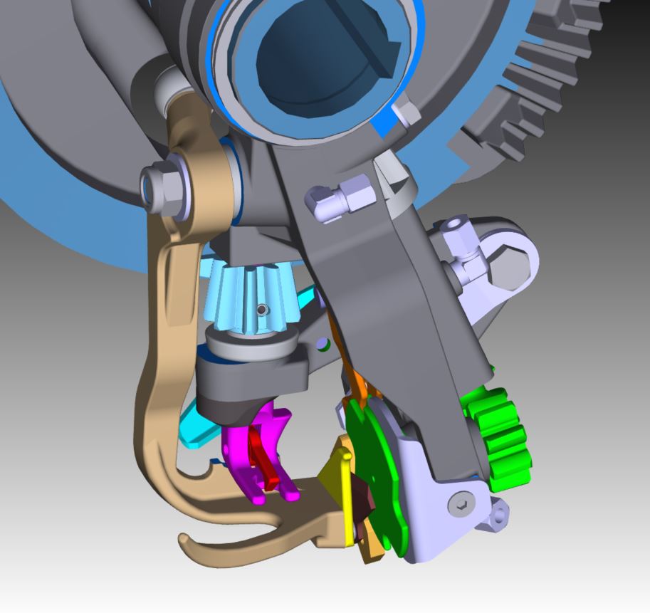De V-vorm; de aan de onderzijde open knoperbek en de nieuwe commandoschijf zijn kernelementen van de nieuwe V-knoper. Het bekende mes van de dubbele knoper op de afschraaphendel is vervangen door een touw uit trekker. Het mes staat daarbij nu stevig op de touwhouder direct voor de touwhouderschijf.