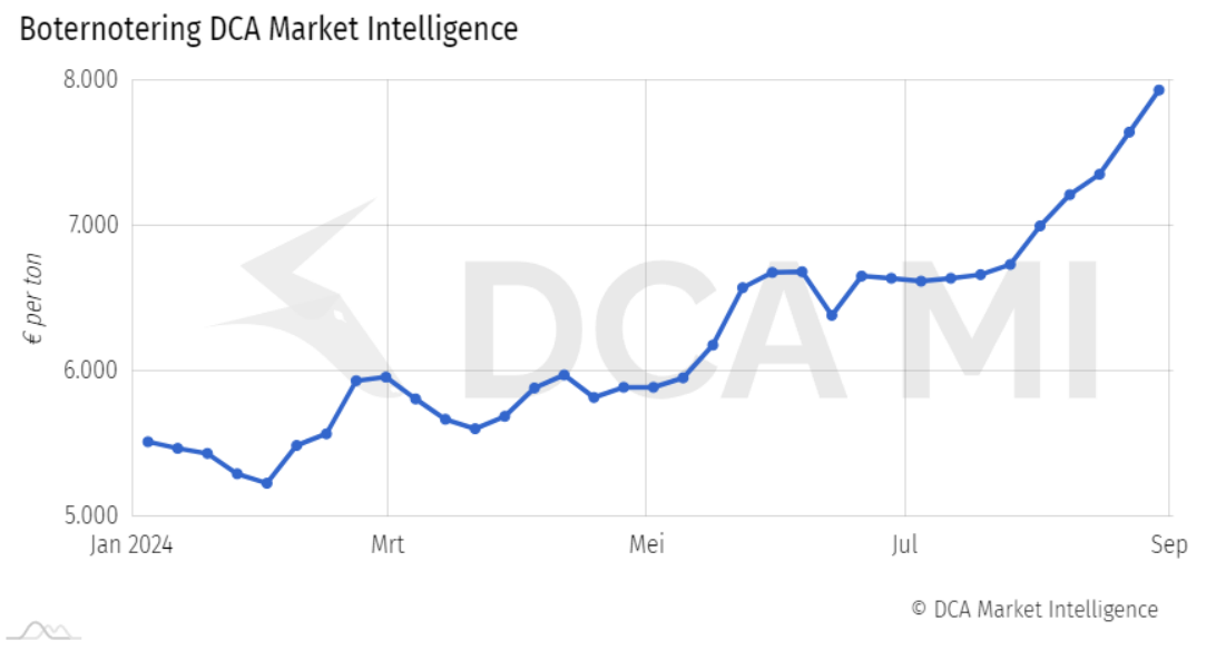 Ook de DCA-roomnotering stijgt snel en is opgeklommen tot 9.845 euro per ton, bijna 1.000 euro per ton hoger dan het vorige record uit 2022. In dat jaar liepen veel grondstofprijzen, als gevolg van de toen net uitgebroken oorlog in Oekraïne, extreem hoog op.