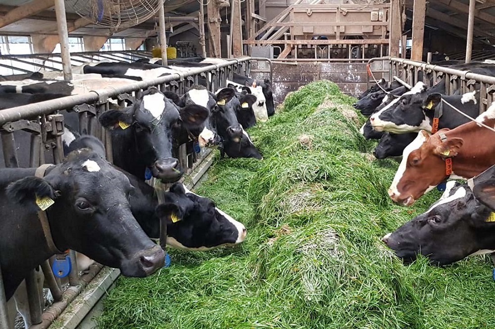 De koeien gaan niet naar buiten, maar Jan brengt het gras naar binnen. Gedurende het seizoen wordt volop vers gras op stal gevoerd. Dat pakt erg goed uit met de Puur als krachtvoer aanvulling naast het verse gras.