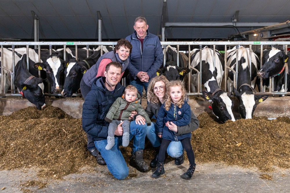 Op het erf van de familie Geerardyn is de ontwikkeling van het bedrijf goed te herkennen aan de gebouwen. De grote strohokken waar de droge koeien in kleine koppeltjes staan, herinneren nog aan de vleesveetak in afbouw. De ruim opgezette melkveestal met zandligboxen uit 2020 geeft duidelijk aan waar de interesse van de familie ligt, bij het melkvee. Met gemiddeld 38,5 kilogram melk per koe en 4,84% vet en 3,44% eiwit is de familie Geerardyn terug te vinden in de top 25 best presenterende bedrijven met een automatisch melksysteem in Vlaanderen. “Ons doel ligt op 3 kilogram vet en eiwit per koe per dag en dat realiseren we nagenoeg”, vertelt Frederik zichtbaar trots.