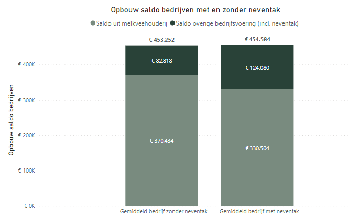 Voor het gemiddelde bedrijf zouden we dan een berekening kunnen maken om de inkomensverschillen op bedrijfsniveau te duiden. Zonder de neventakken mee te nemen, zien we aardig verschil in de totale saldo´s (zie het lichte gedeelte uit de kolommen van de grafiek). Het verschil van bijna 40.000 euro is vooral toe te wijzen aan de ietwat grotere omvang van de bedrijven zonder neventak. Dit verschil wordt weggenomen wanneer we het extra saldo uit de neventak meenemen in onze berekeningen (het donkere stuk uit de kolommen van de grafiek).