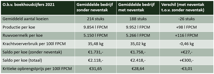 Voor het schrijven van dit artikel hebben we een analyse gedaan van de boekhouddata van in totaal 140 bedrijven. Hiervan zijn er 90 bedrijven die geen significante neventak bij hun bedrijf hebben, en 50 met een inkomen van meer dan 5,00 euro per 100 liter FPCM uit andere activiteiten dan melkvee. Dit kan bijvoorbeeld akkerbouw of varkenshouderij zijn, maar ook boerderijzuivel of kinderopvang.