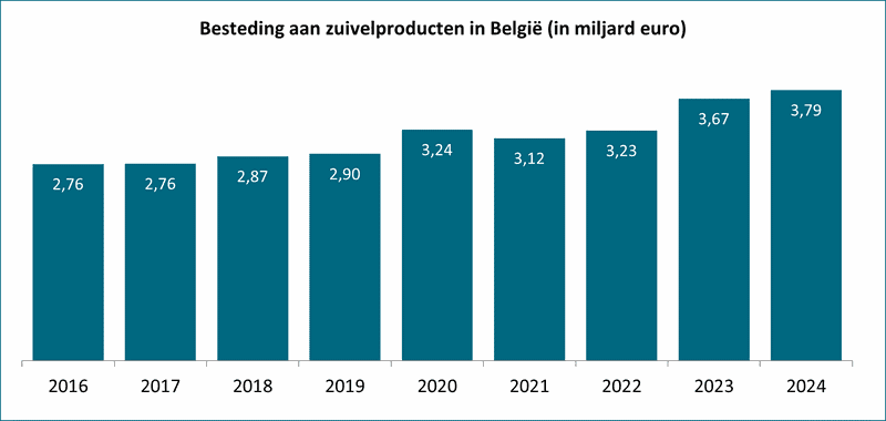 Zuivel blijft stevig verankerd in het eetpatroon van de meeste Belgen. In 2024 gaf maar liefst 72% van de Belgen tussen 18 en 75 jaar aan dat ze de dag voordien minstens één zuivelproduct hadden geconsumeerd. De zuivelproducten met de hoogste dagpenetratie zijn melk, kaas, boter en yoghurt.
