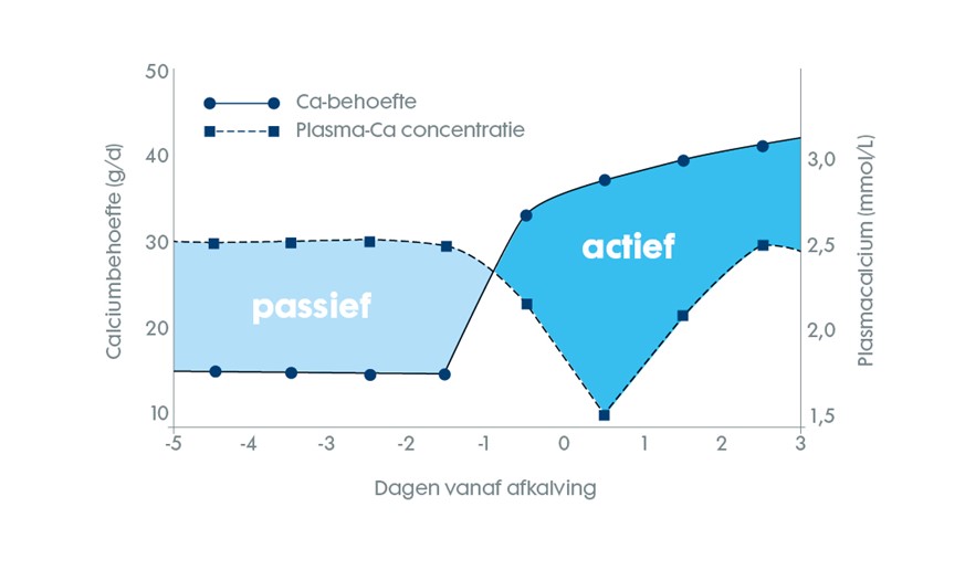 Melk- of kalfziekte ontstaat door een tekort aan beschikbaar Ca rond afkalven. Dit betekent echter niet dat er te weinig Ca gevoerd wordt voor afkalven. Integendeel! De Ca-opname in de darm wordt door de lage Ca-behoefte in verhouding tot de beschikbaarheid tijdens de droogstand als het ware in de slaapstand gezet. Rond afkalven neemt de Ca-behoefte voor biest- en melkproductie ineens enorm toe, waardoor het beschikbare Ca in de biest en melk verdwijnt (figuur 1). De koe is op dat moment niet in staat om voldoende Ca uit de botten vrij te maken of in de darm op te nemen. Het voeren van Ca in de droogstand heeft dus eerder negatieve dan positieve gevolgen ter voorkoming van melkziekte.