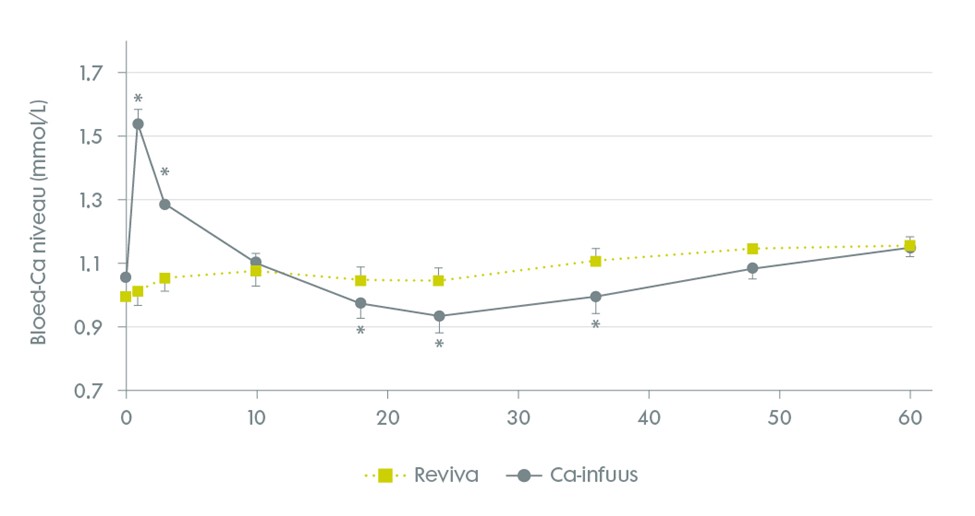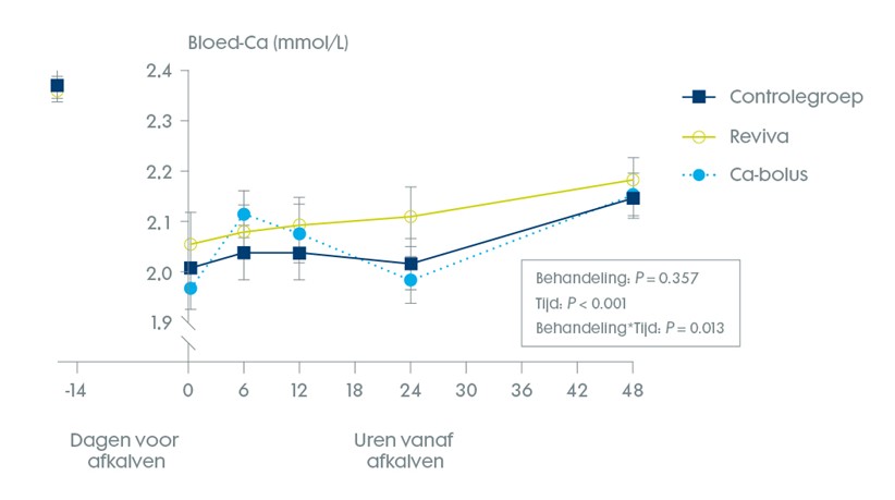 Op het moment van afkalven is er extra behoefte aan Ca. Een Ca-bolus is gemakkelijk toe te dienen en je bent ervan verzekerd dat het de koe in gaat. Om meer stress rond afkalven te voorkomen, wil je echter het liefst dat de koe het Ca zelf opneemt. Dit is mogelijk door een koedrank toe te dienen. Na afkalven doet een koedrank voor het Ca-gehalte in het bloed niet onder voor een Ca-bolus blijkt uit een nog niet gepubliceerde interne studie. Sterker nog: na verstrekking van koedrank Reviva blijft het bloed-Ca niveau vanaf afkalven stijgen, terwijl het bloed-Ca niveau bij gebruik van een Ca-bolus na afkalven juist na 24 uur een dip laat zien (figuur 2).