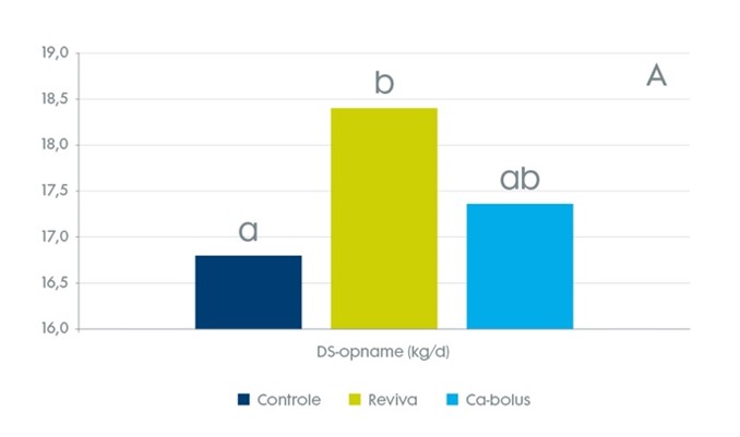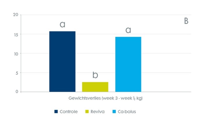 Direct na kalven heeft een koe naast calcium behoefte aan water, energie, vitamines en mineralen. Een recente studie laat zien dat Reviva de voeropname in de eerste weken stimuleert (figuur 4A) resulterend in aanzienlijk minder gewichtsverlies dan koeien die een Ca-bolus kregen (figuur 4B). Daarnaast geven de bloedparameters een indicatie voor een lager cortisolgehalte voor de Reviva-groep, wat wijst op een lager stressniveau.