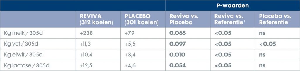 Reviva-koeien produceerden over de gehele lactatie gemiddeld 0,78kg/dag meer melk met een iets hoger eiwitpercentage (0,02%) (P<0,05) dan werd verwacht. De melkproductie van de Reviva-koeien was 0,52kg/dag hoger dan de placebo-koeien (P=0,065). De extra geproduceerde kg vet en eiwit zijn vermeld in tabel 1. De studie laat tevens zien dat het verstrekken van lauwwarm water (placebo) direct na het afkalven zorgt voor een hogere vetproductie, maar met het eenmalig verstrekken van Reviva zijn de extra opbrengsten maar liefst €105 per lactatie hoger dan wat op basis van de CRV-data werd verwacht (RFC, garantieprijs juni 2021)!