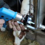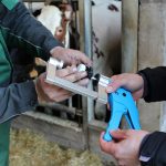 Bruno en Hannes tonen dat de techniek zich in een handomdraai laat installeren. Eerst wordt het nummer van de sensor bekeken, kwestie van die aan het juiste dier te kunnen koppelen. Daarna wordt de oorsensor in de applicator – ‘de schieter’ – gemonteerd, inclusief het vrouwelijk deel. Magneetjes in die applicator activeren de sensor. Getuige: je krijgt driemaal een kleine lichtflits te zien. De sensor is nu aangemeld. Stap daarna rustig op het in het hek gefixeerde dier af. In een reactie zal het dier zich achteruit trekken zodat je makkelijk de juiste positie kan bepalen. De sensor moet bovenaan binnen in het oor komen te zitten. Schiet hem erin zoals je dat met een gewoon oormerk doet. Afsluitend moet je even voelen of de sensor los zit.