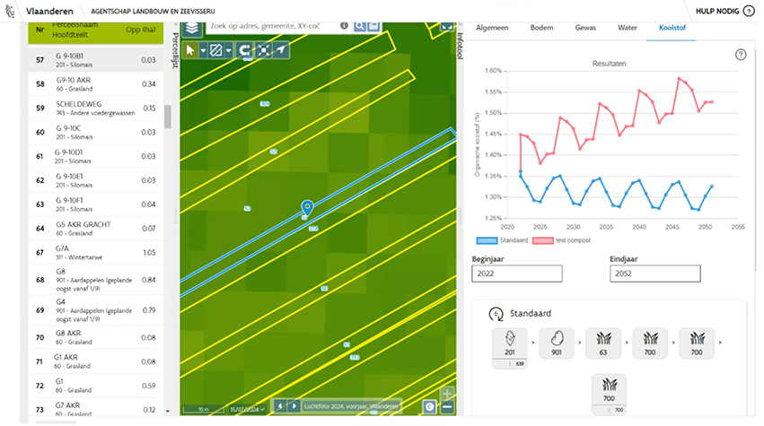 De Koolstoftool geeft een zo goed mogelijke simulatie over de mogelijke koolstofopslag op basis van de beschikbare gegevens en vertrekt van een bepaalde startconcentratie aan organische koolstof. Hoe accurater deze gegevens zijn, hoe beter het model de simulaties kan doorrekenen. Het gebruik van recente bodemanalyseresultaten kan de resultaten dus verbeteren. Daarom raden we de landbouwers aan om het organische koolstofgehalte van de percelen ook laten te meten met behulp van staalnames. De landbouwer kan hiervoor steun krijgen door de ecoregeling “Verhogen organische koolstof – streefzone” of de ecoregeling “Actief gebruik van het bodempaspoort” aan te vragen. Meer info hierover vindt u in de fiches op de website: ecoregeling “Verhogen organische koolstof – streefzone” of de ecoregeling “Actief gebruik van het bodempaspoort”.