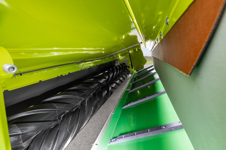 Een bijzonder detail is de innovatieve gewasstroom. De rollen van de kneuzers zijn standaard door middel van een dubbele rollenaandrijving met een speciaal ontwikkeld schaarmechanisme aangedreven voor een maximale doorvoer en lange levensduur, ook wanneer er langdurig onder zware omstandigheden is gewerkt. De aandrijfkast en aandrijflijn zijn onder andere, samen met de door Walterscheid ontwikkelde, grote P-Line drievoudige, telescopische aftakassen van speciaal gehard staal en een nieuwe K-90 wrijfkoppeling, ontworpen voor gebruik met tractoren tot 500 pk. Dankzij deze combinatie is het op dit moment de krachtigste bandmaaier met kneuzer op de markt.