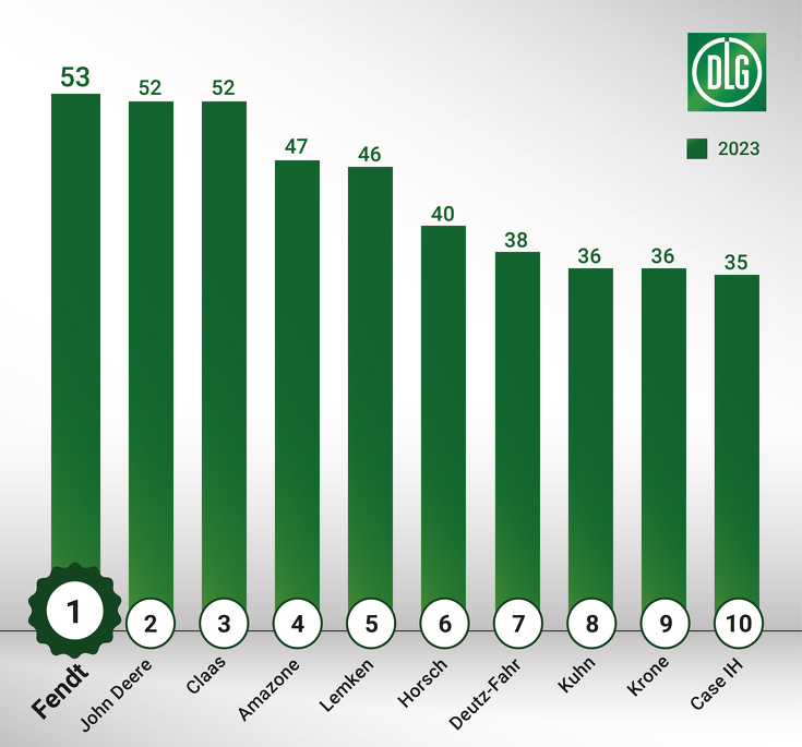 In 2023 heeft Fendt 53 punten gescoord in de DLG ImageBarometer. Daarmee scoort de Duitse fabrikant de hoogste score, maar in 2022 waren dit nog 62 punten. John Deere en Claas volgen met 52 punten. Op plek 4 eindigt Amazone met 47 punten en net daaronder komt Lemken met 46 punten. De top tien wordt afgesloten met Horsch (40), Deutz-Fahr (38), Kuhn (36), Krone (36) en Case IH (35).