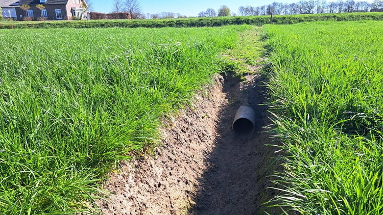 “Zaak was allereerst te zorgen dat er op die plek niet langer water bleef staan. Afwateren was echter lastig. Er was geen sloot in de buurt en om bij de sloot vooraan het perceel te komen, moest een hoogte van wel 25 centimeter worden overwonnen. En daarbij wil je dan ook nog afschot hebben. Kilveren was geen optie. Dan moet je echt het hele perceel dat wel 350 meter lang is, van voor naar achter pakken. Onbegonnen werk”, zo stelt Van Dal. Als oplossing kozen de melkveehouder en de adviseur voor een greppel van voor naar achteren recht evenredig aan de boerderij. In de kopakker werd met behulp van een buis een brede dam gecreëerd. Deze greppel werd vorig jaar aangelegd.