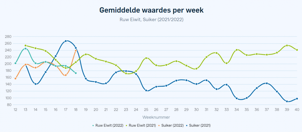 Door het hele land vallen de hoge drogestofpercentages van het verse gras op. Deze variëren van 23% tot maar liefst 28%! Houd hier rekening mee met het inscharen, koeien hebben dus mogelijk een kleiner oppervlakte nodig dan u op basis van ervaring zou verwachten! Vanwege de koude nachten en zonnige dagen zijn de suikergehalten behoorlijk opgelopen! Dit zorgt voor zeer smakelijk gras. Het eiwitgehalte blijft mooi op peil, al hoewel het lager is dan voorgaande jaren is het in combinatie met het hoge suiker wel zeer goed te benutten!