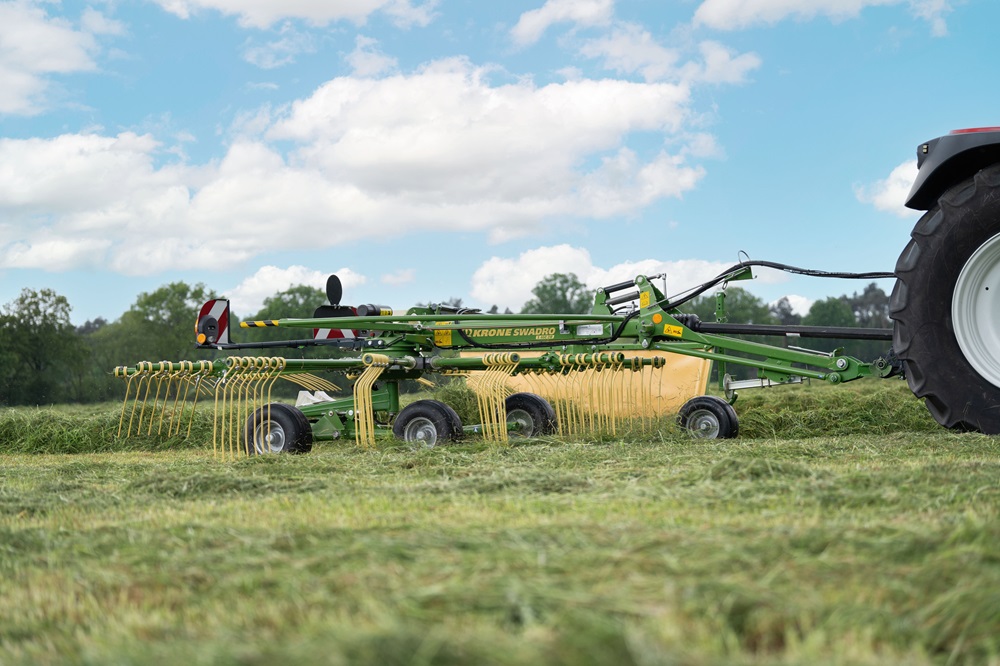 Spelle, juli 2024: met de Swadro S 460 DB sluit Krone de revisie van zijn totale programma enkele harken af. Als onderdeel van de nieuwe generatie lost deze machine de sinds 2006 gebouwde machine Swadro 46 T af, waarvan deze zich alleen al door het eenvoudig herkenbare nieuwe design van de huidige standaard enkele harken (Swadro S 380, S 420, S 460) onderscheidt.