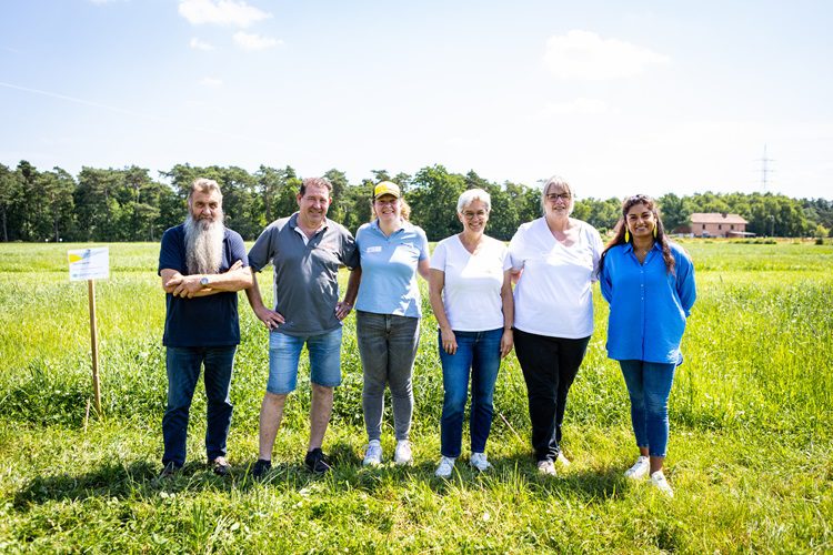 Van links naar rechts Wilfried Verdoodt (Timac), Gert Van den Eynde (Agropak), Florine Van Kersschaver (Barenburg), directeur Hooibeekhoeve Ilse Van den Broeck, onderzoeker Hooibeekhoeve An Schellekens en gedeputeerde voor Landbouw Jinnih Beels op de proefvelden van Herbgrass in Geel.
