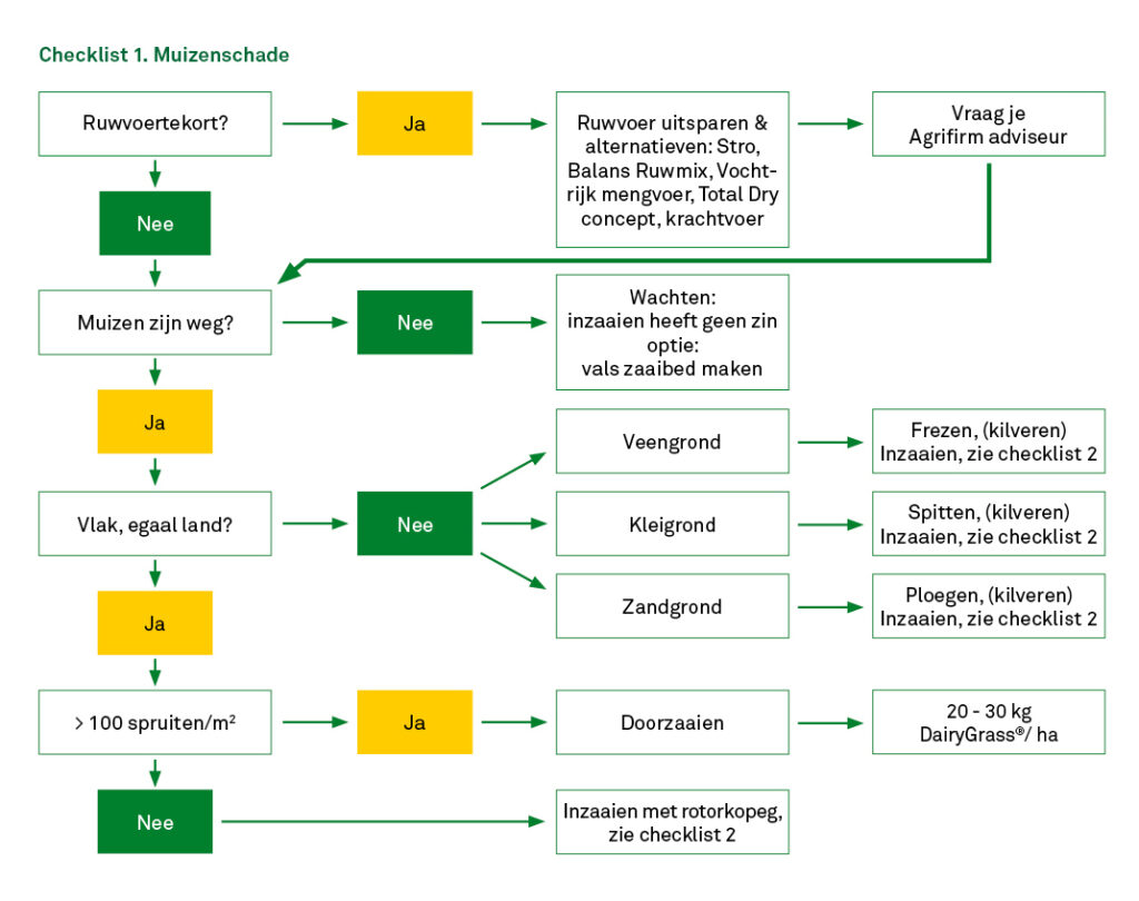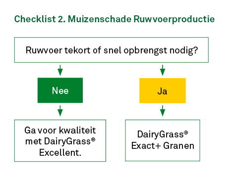 Wie snel ruwvoer nodig heeft, kan overwegen om bij herinzaai een graancomponent toe te voegen. “Dan heb je sneller opbrengst, maar de kwaliteit is wel anders dan bij puur Engels raaigras”, vertelt Van der Zijpp. Tot slot speelt de ruwvoervoorraad op het bedrijf een doorslaggevende rol. Bij een tekort is snel handelen noodzakelijk en kan tijdelijk worden uitgeweken naar alternatieve ruwvoerproducten in het rantsoen. Hoe dan ook geldt: herstel van de grasmat is noodzakelijk. Door de juiste keuzes te maken op het juiste moment, kan muizenschade effectief worden aangepakt en blijft de impact op de bedrijfsvoering beperkt.